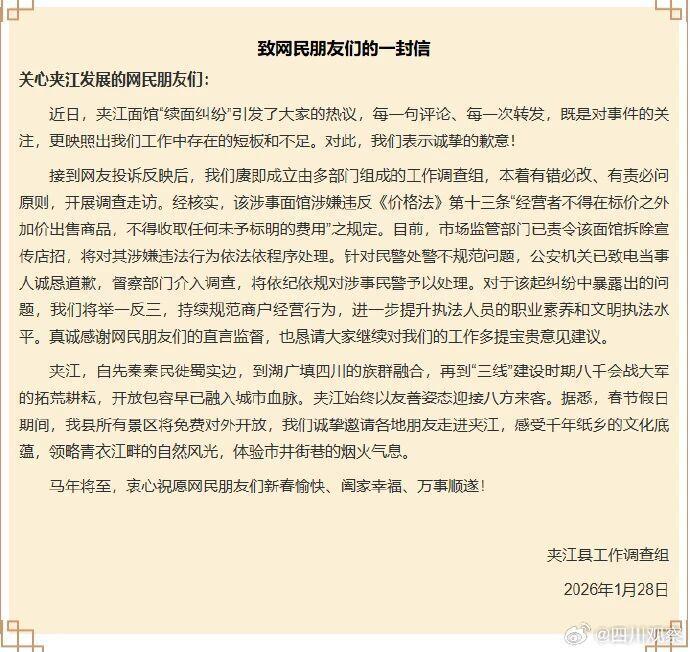 1月28日,夹江县工作调查组发布《致网民朋友们的一封信》:近日,夹江面馆“续面纠纷”引发了大家的热议,每一句评论、每一次转发,既是对事件的关注,更映照出我们工作中存在的短板和不足。对此,我们表示诚挚的歉意!